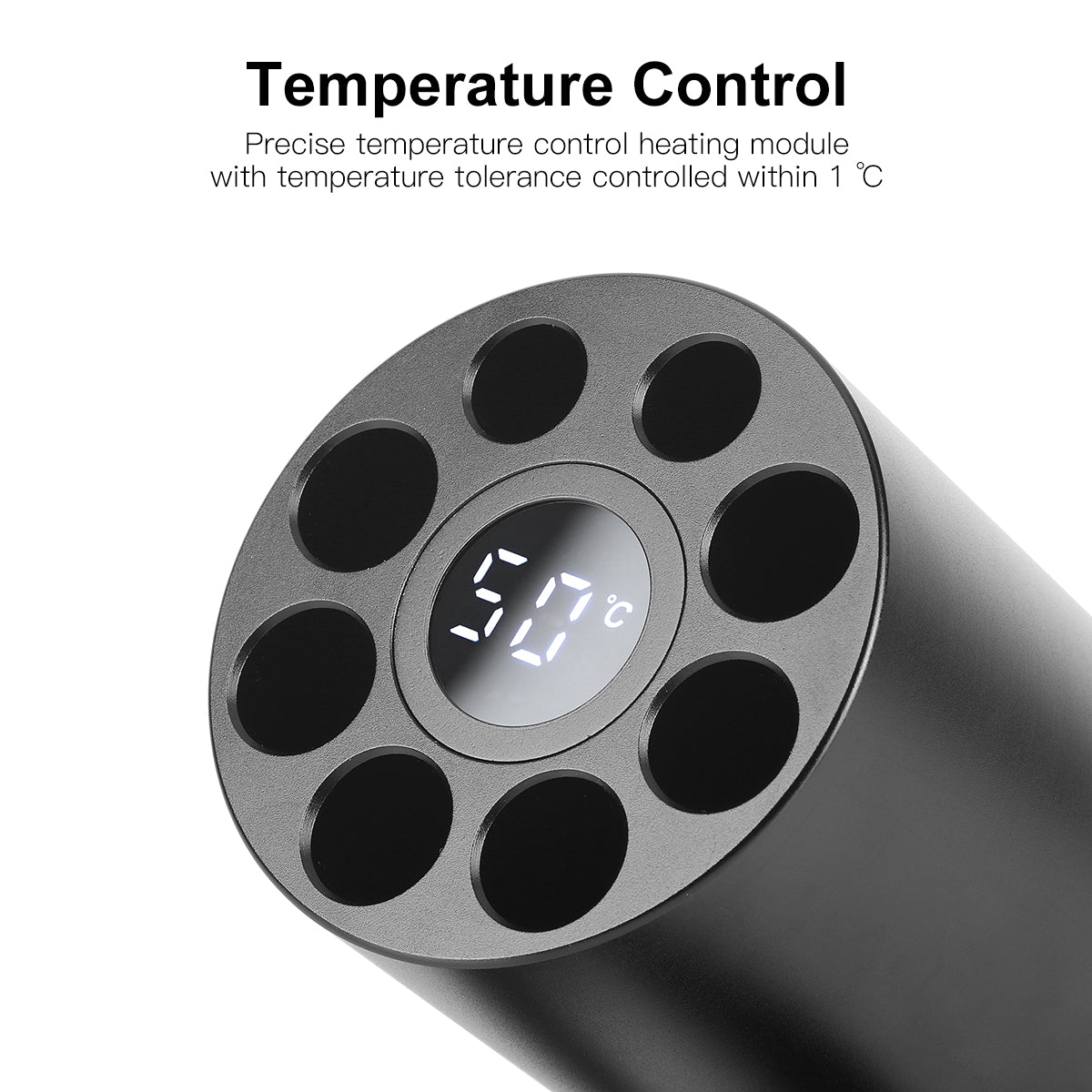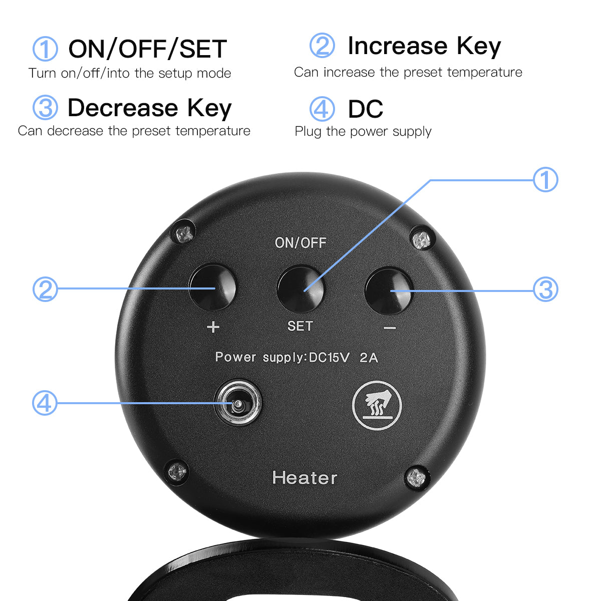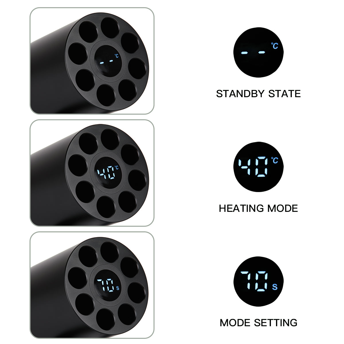 Power on to display current status. Press ON/OFF/SET to begin heating at your last-used temperature, or use +/- buttons to adjust settings in 1-degree increments. The unit automatically stops heating once the preset temperature is reached, ensuring consistent results every time.